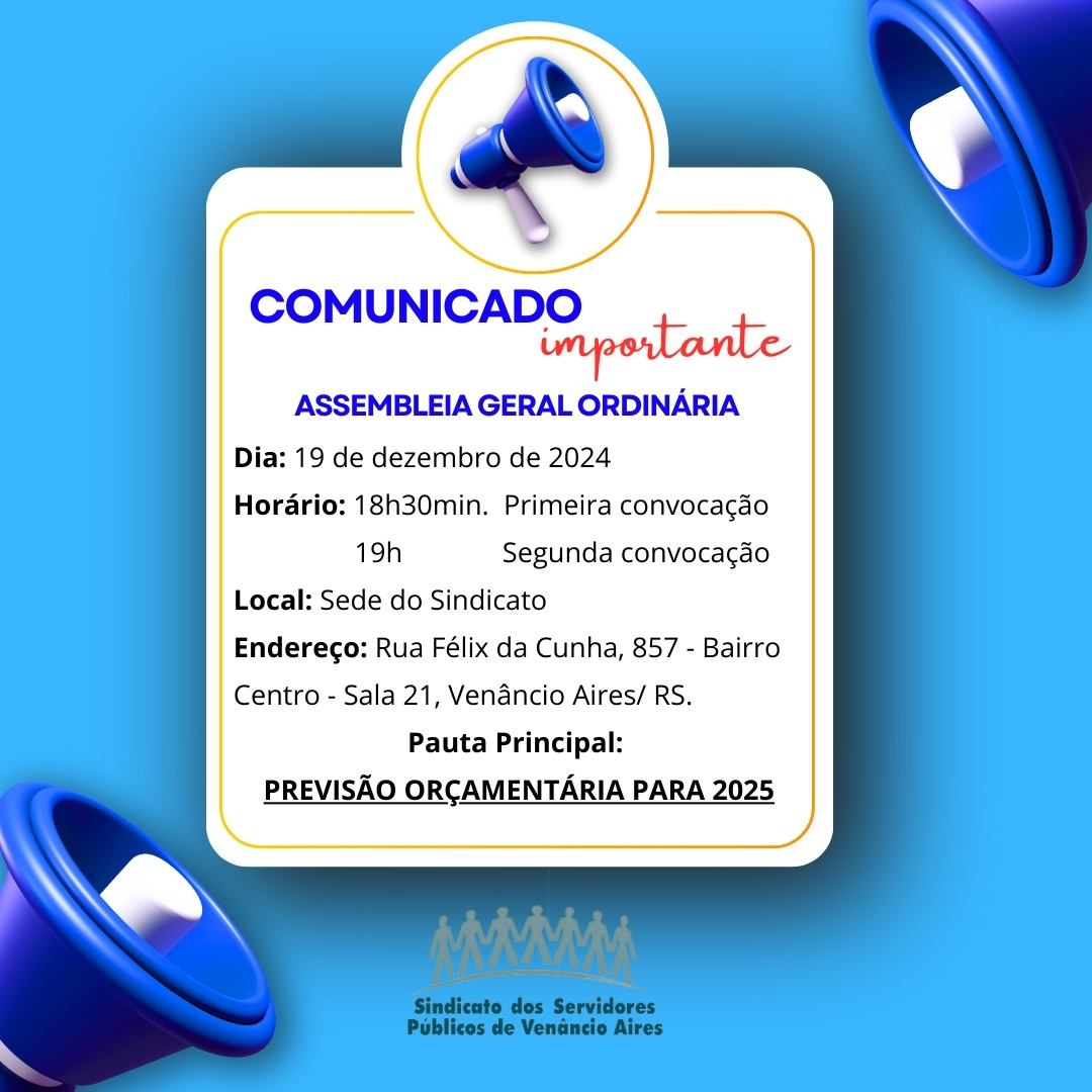 O Sindicato dos Servidores Públicos do Município de Venâncio Aires convoca os servidores associados, quites com suas obrigações sociais, para a ASSEMBLÉIA GERAL ORDINÁRIA.